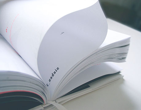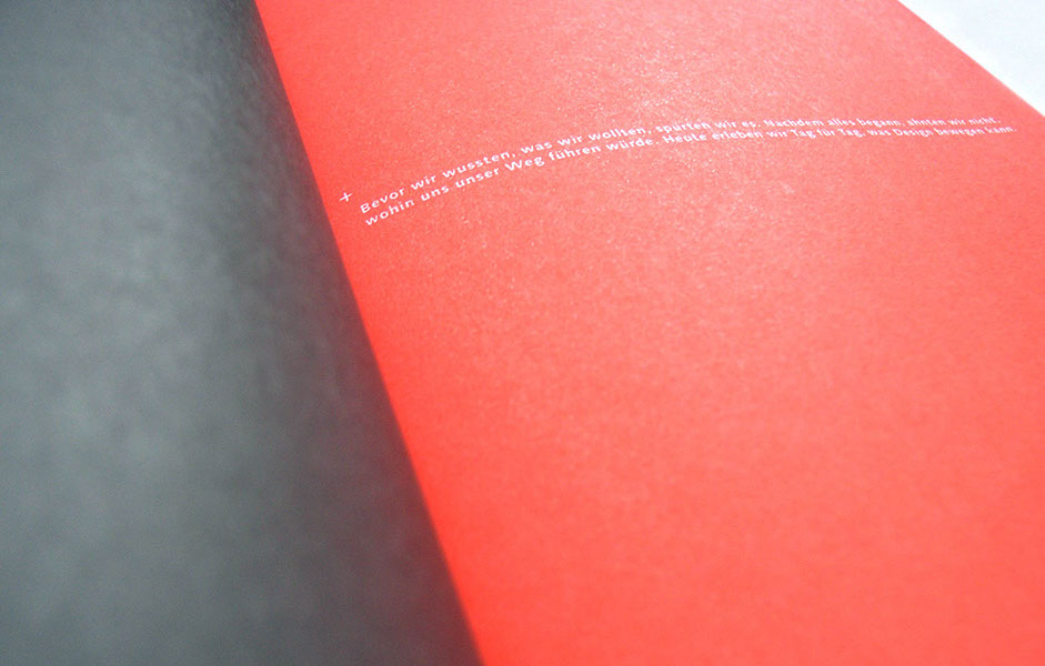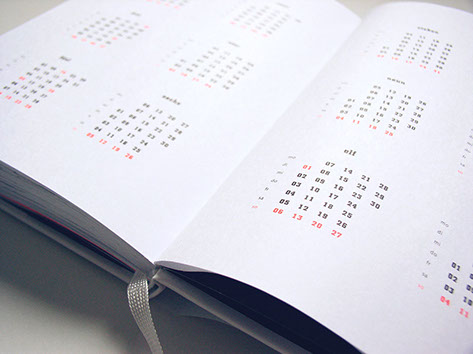 hw-design wurden auf die Vorderseite, Kalendarium, Fotos und Illustrationen wurden spiegelverkehrt auf die Rückseite (Innenseite) der Schlingen gedruckt und scheinen durch. Somit entsteht ein typografisches Wechselspiel zwischen innen und außen, seitenrichtig und spiegelverkehrt.